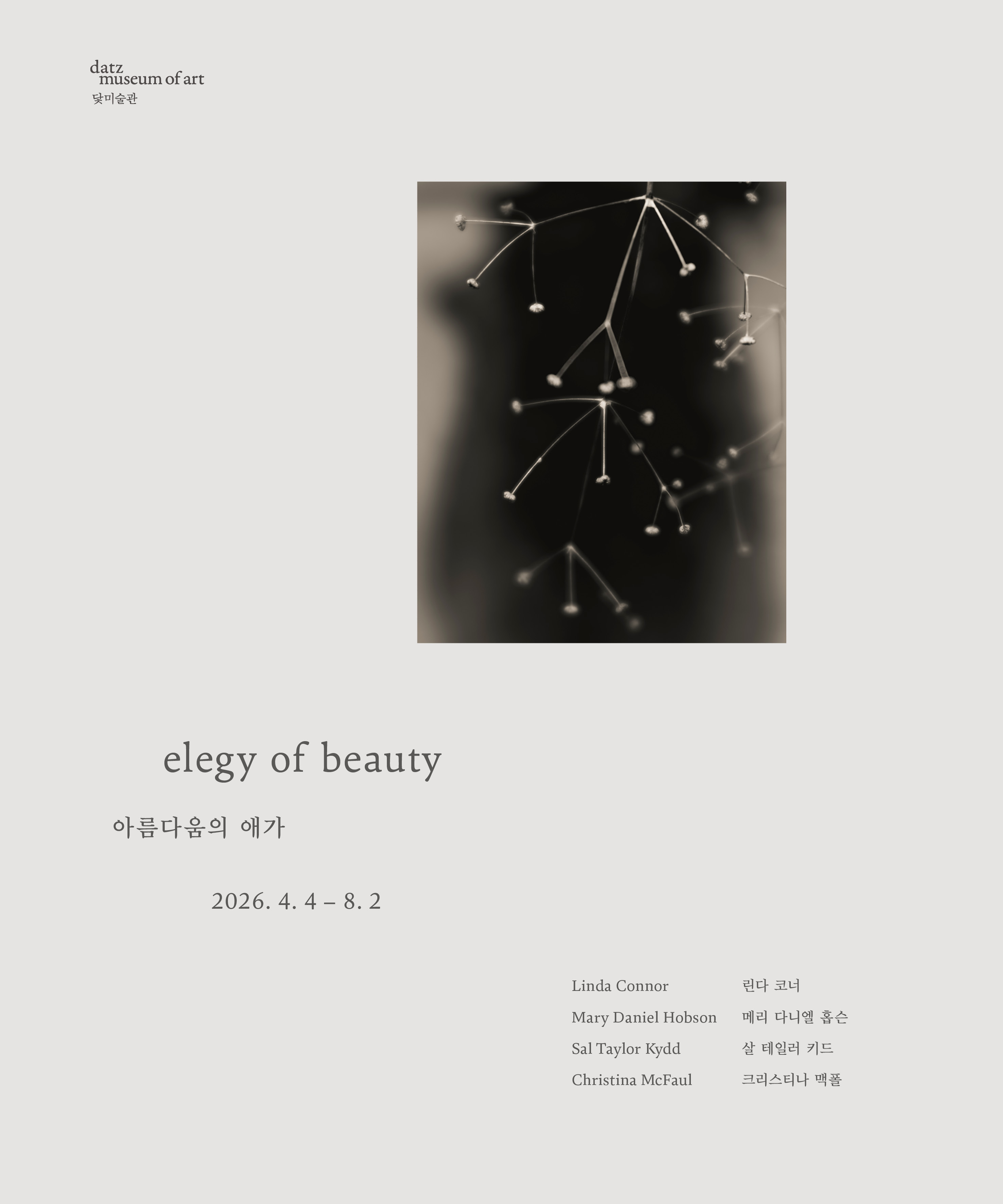 아름다움의 애가elegy of beauty 2026. 4. 4 Sat – 8. 2 Sun 린다 코너 Linda Connor메리 다니엘 홉슨 Mary Daniel Hobson살 테일러 키드 Sal Taylor Kydd크리스티나 맥폴 Christina McFaul